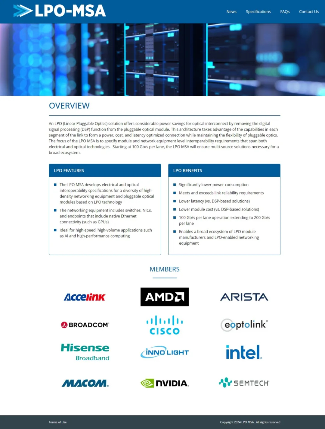 The LPO MSA founding members include Accelink, AMD, Arista, Broadcom, Cisco, Eoptolink, Hisense, Innolight, Intel, MACOM, NVIDIA, and Semtech Corporation.